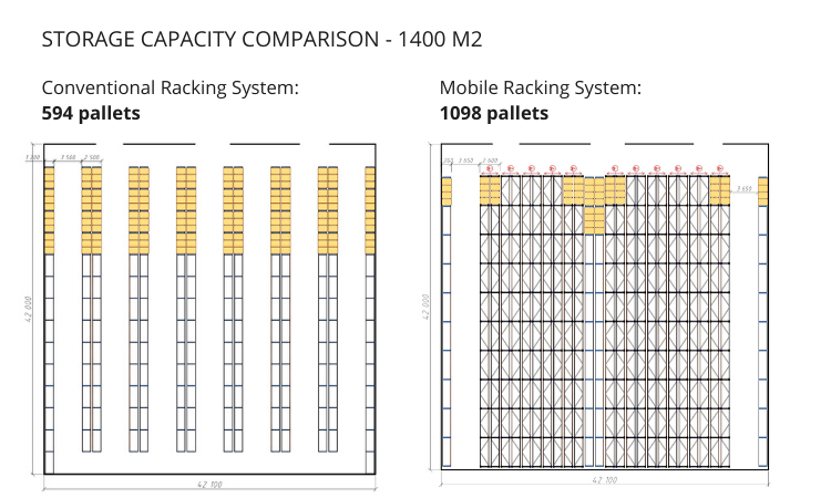 The mobile shelving system is one of the most efficient storage solutions, offering increased capacity and direct access to each pallet.